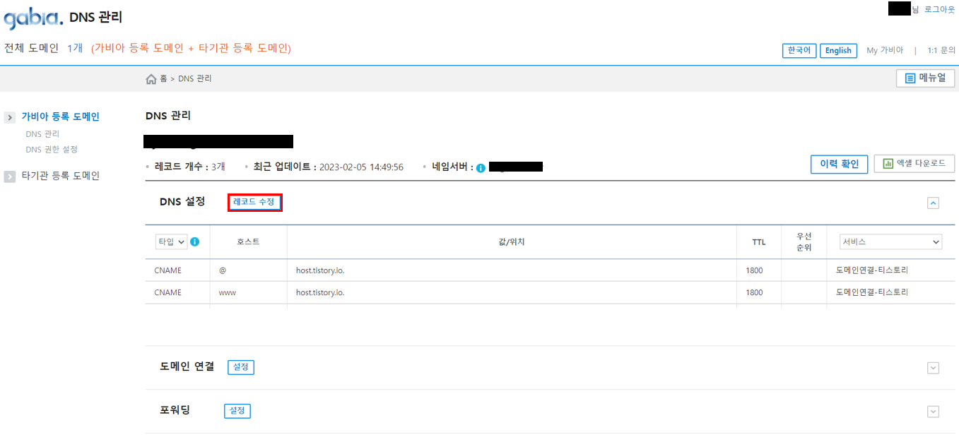 DNS 설정 항목에서 레코드 수정을 누릅니다.