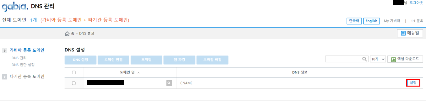 DNS 추가를 할 도메인 -  설정을 누릅니다.