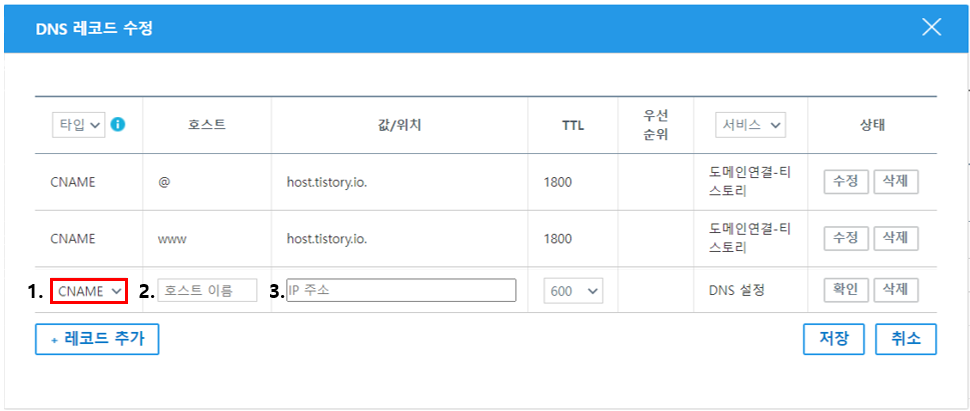 3. 항목에는 host.tistory.io 를 입력하시면 되고 TTL 값은 600 으로 두셔도 무방합니다.