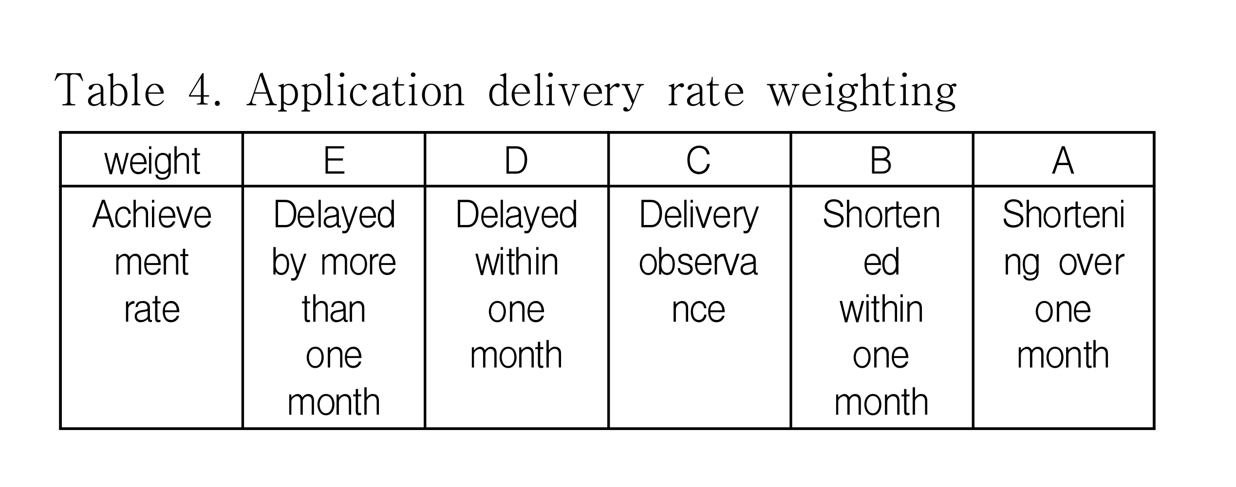 Application 부분의 특정 지표로는 프로젝트 납기 달성률과 개선 요구 납기 준수률, System Down time 으로 구성하였다.