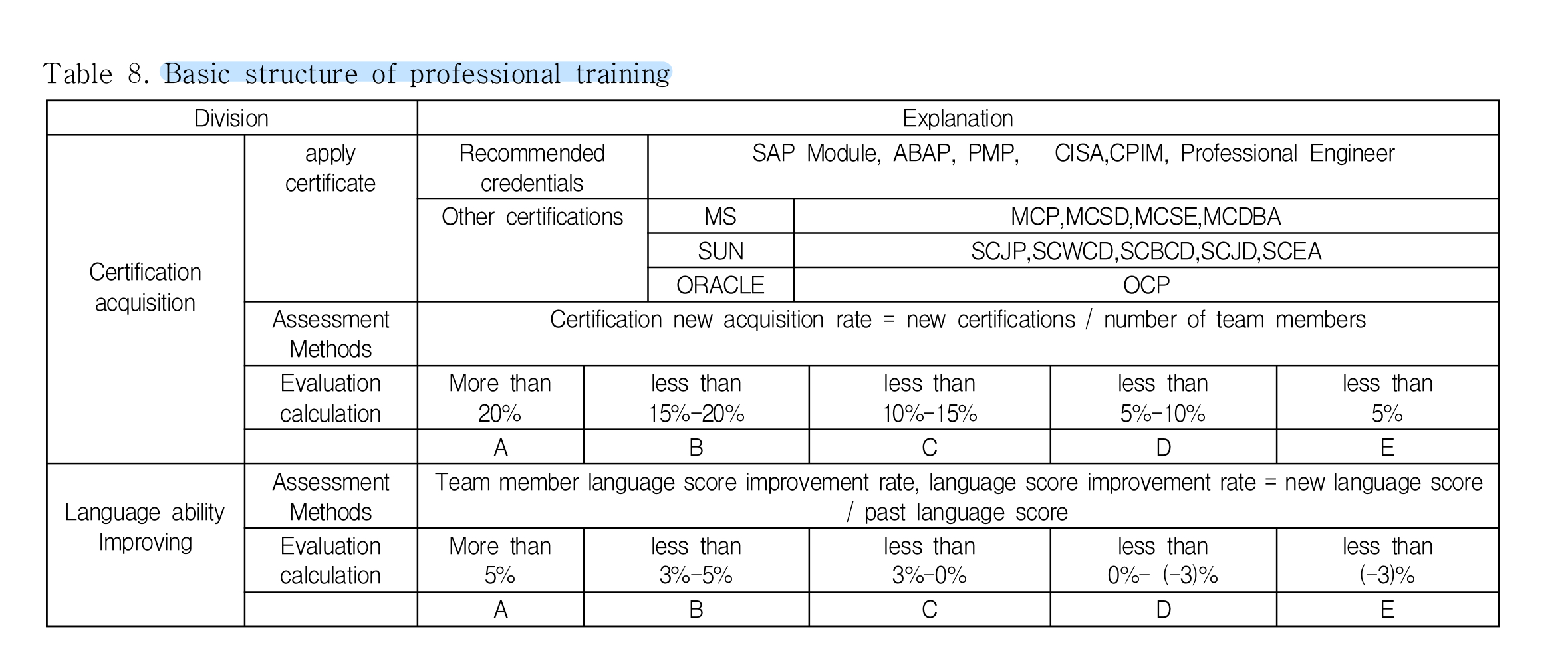 전문인력 양성 특성지표는 객관적인 평가 가능한 항목으로 구성하였으며, 교육 성과에 따른 객관적인 평가는 자격증 취득과 공인 점수의 취득으로 나누어 구성하였다.
